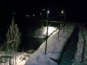 Selvom elven fortsatt er skummel og kan være skikkelig stri, er den jo ganske vakker i skinnet fra gatelykten en vintermorgen. Ikke vanskelig å komme i julestemning nå!