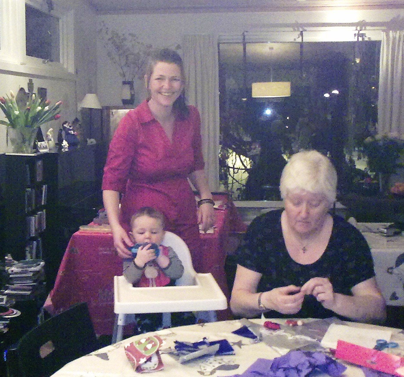 “Oppsettet” er greit: Vi fyller stuen med bord og stoler fra Ikea, og plasserer kurver og nett og poser med glanspapir og filt og heklenåler og strikkepinner og sakser og hyssing og trekuler og maleskrin og limtuber på alle bord. Og så har de fleste med seg ett-eller-annet “prosjekt” som de lærer bort til andre. Resultatene blir alltid imponerende – men det er jo prosessene: Det å sitte ned og lage ting sammen, som er viktige! Forørvrig er reglene for kvelden veldig klare: Alle må lage minst to “ting”, som må godkjennes av en jury (Egil og Knut), før de får lov til å forsyne seg med mat. Vi tviholder på at dette er et “verksted” og ingen vanlig “familiemiddag”!