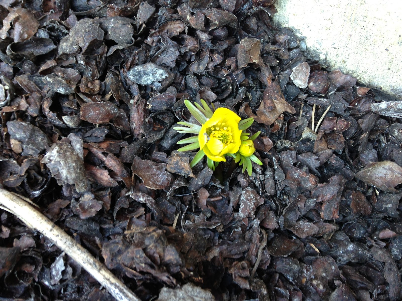 …..men helt innerst ved sørveggen har en eneste liten eranthis (vinterblom) tatt sjansen på å stikke hodet opp. Er det ikke fantastisk?