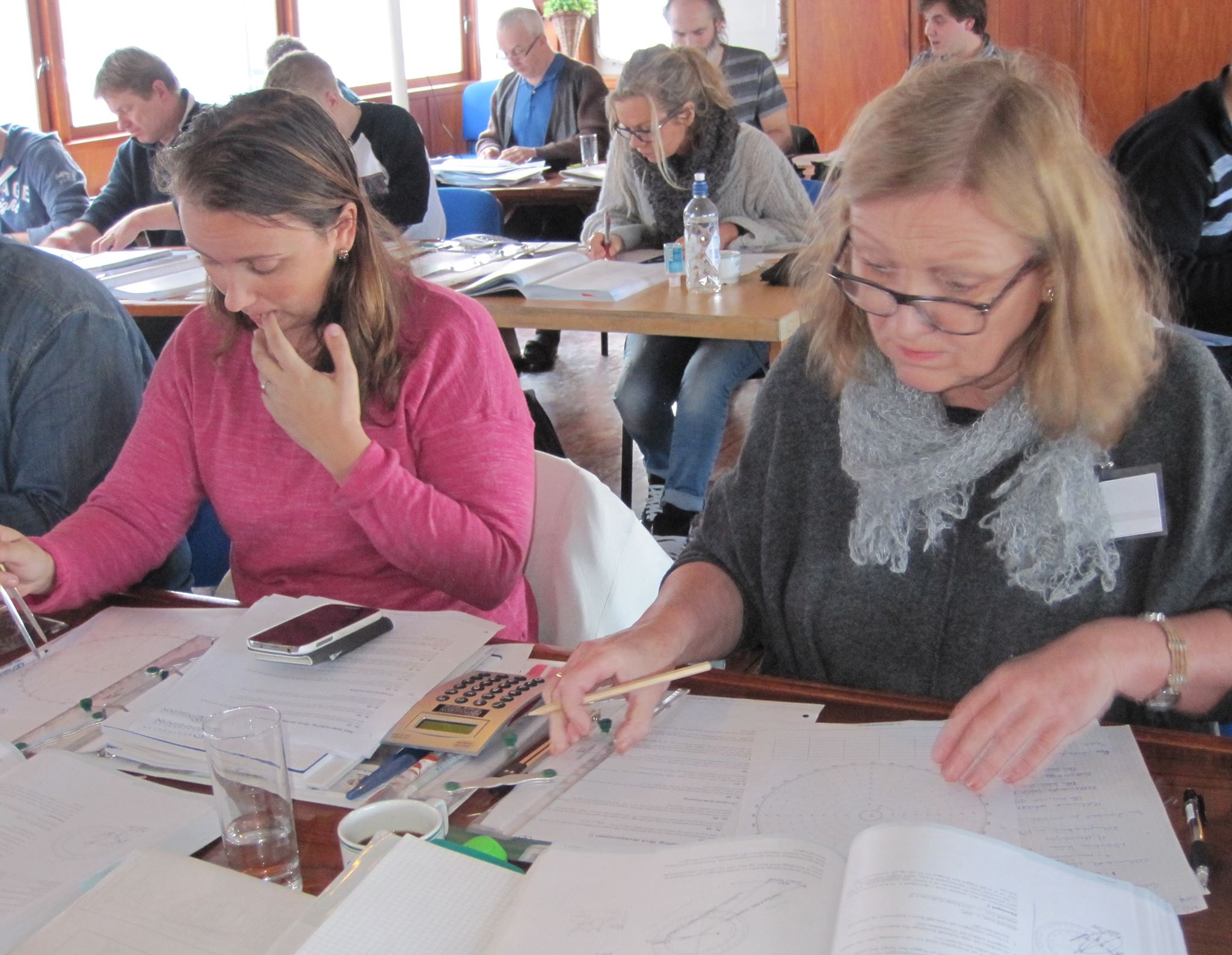 Det var undervisning fra tidlig morgen til sen kveld, bare avbrutt av korte måltider. Og etter undervisningen var det oppgaveløsning. Jeg kan ikke huske at jeg har vært med på et så intenst opplegg noen gang! Til tider var tempoet så høyt at jeg bare hadde lyst til å kaste inn håndklet. Tårene sprutet og blyant og passer ble pælmet i dørken……… Jeg følte meg dum og udugelig og håpløs og var fast bestemt på aldri å sette mine ben ombord på en båt igjen! Hardangervidda neste!